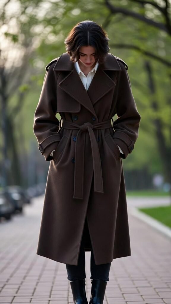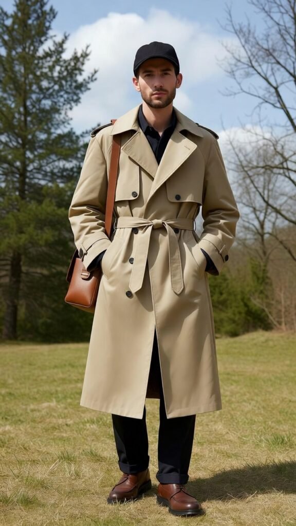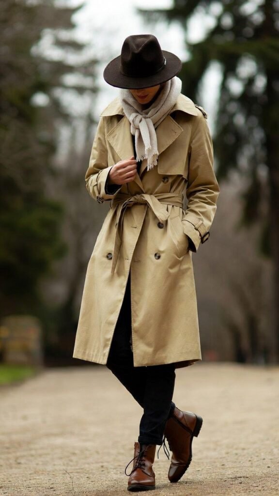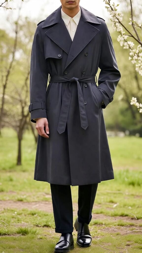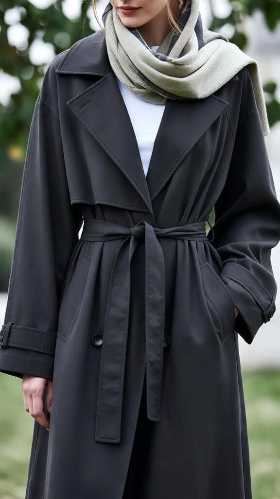 - Double-Breasted Trench + All-Black Outfit – Classic trench over sleek black ensemble.