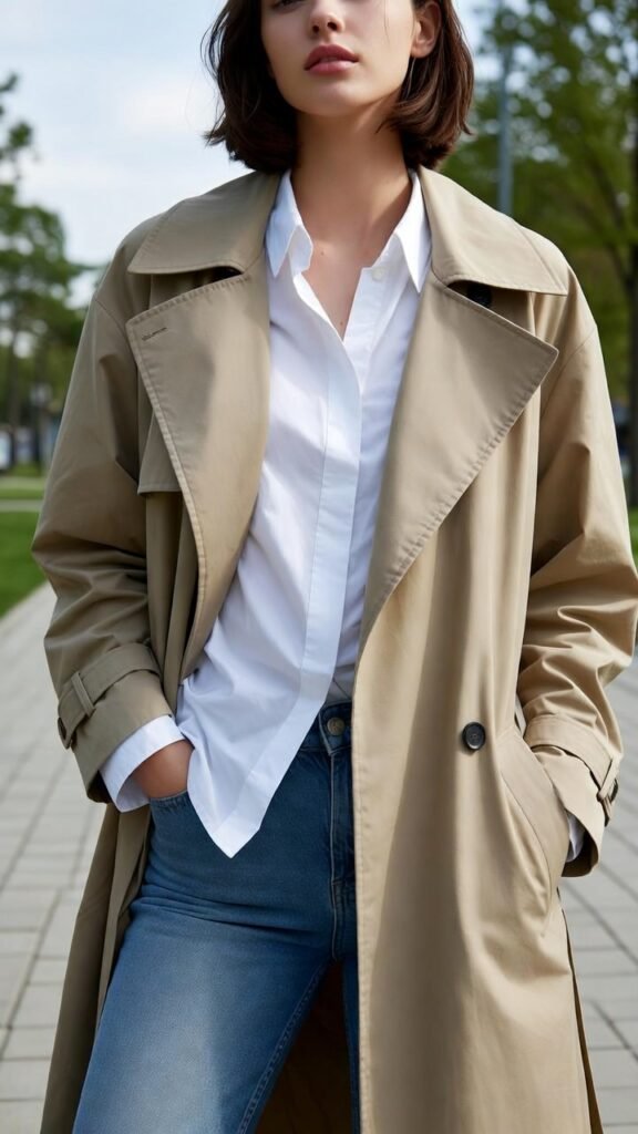 - Beige Trench + White Shirt + Wide-Leg Jeans – Crisp white button-down tucked into high-waisted light-wash jeans.
