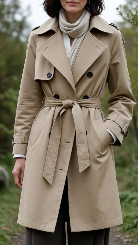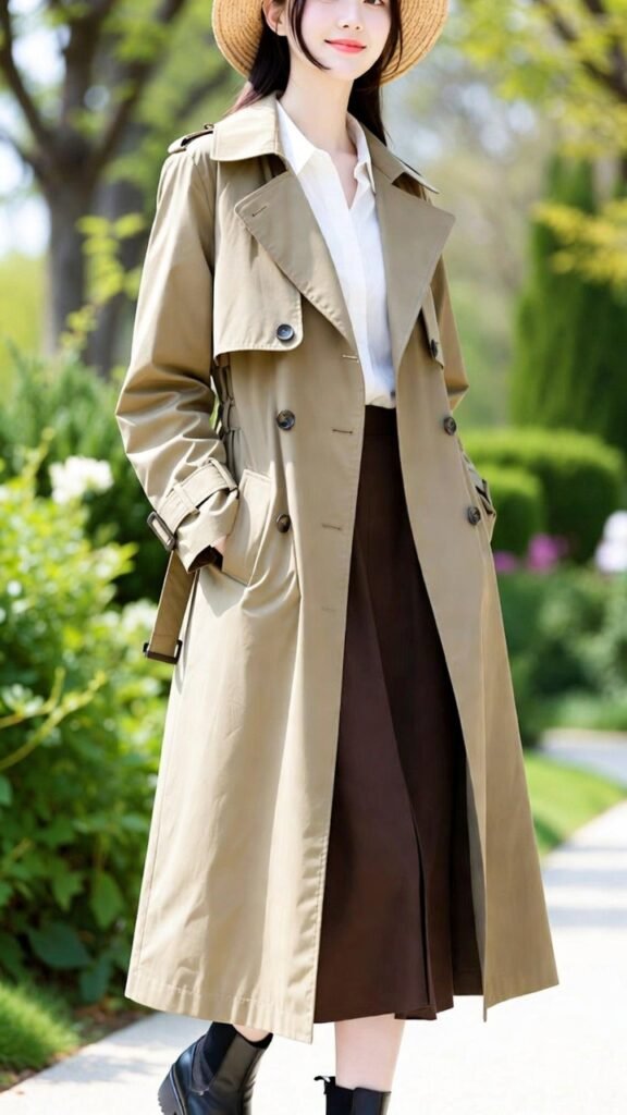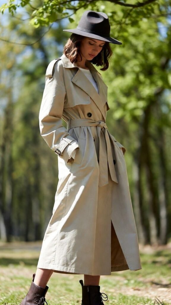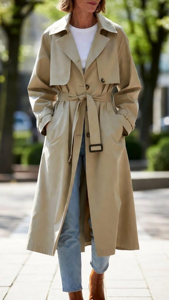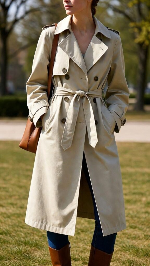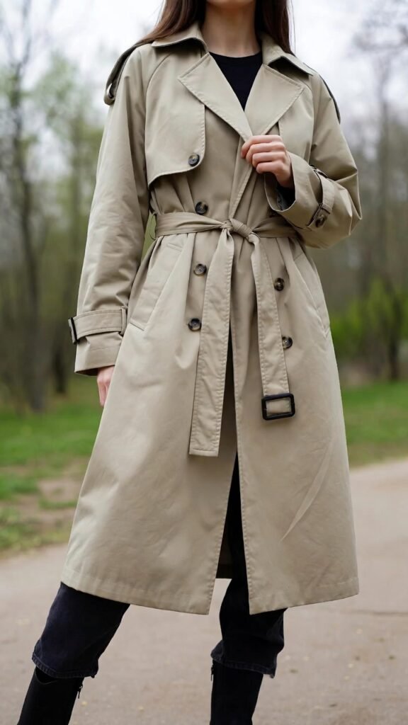 Fabric matters: cotton gabardine for classic, wool blends for cooler days, technical fabrics for rain. Colour choice: beige is eternally chic, black is modern, pastels are fresh. Styling rule: the trench should be the loudest piece—keep the rest simple and let it shine. Layer underneath for temperature swings: light knits, silk blouses, or thin sweaters. Shoes: loafers, ballet flats, ankle boots, or sneakers. Accessories: minimal gold jewelry, leather crossbody, or structured tote.