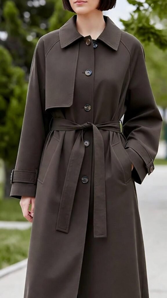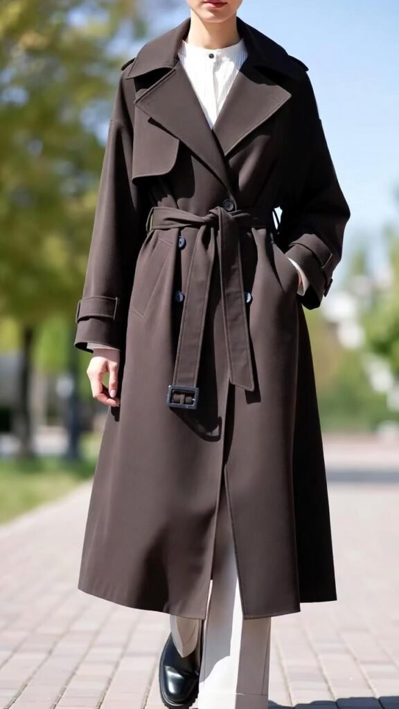 - Classic trench: hits mid-calf, double-breasted, belted